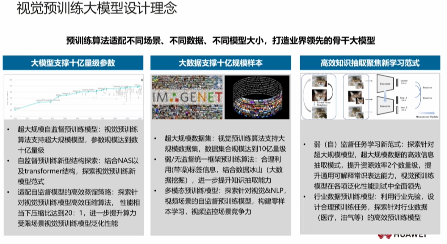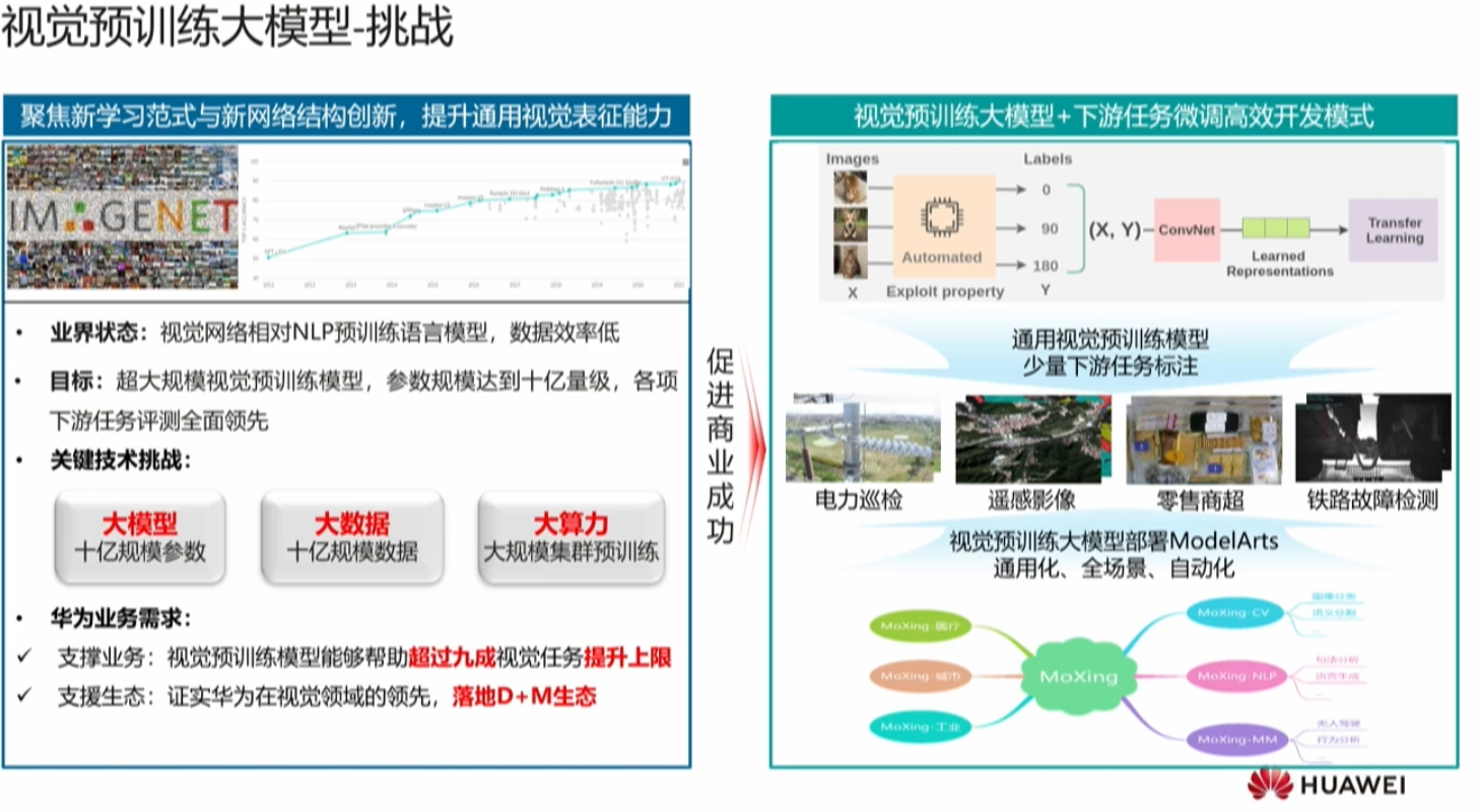 愿景,使用一种通用的视觉预训练模型,一旦训练完成,在下游更新迭代的算力要求可以承受,许多场景在较小数据标注,在更快的迭代周期获得更好的性能,甚至在某些场景不需要进行适配就可以获得更好的结果。