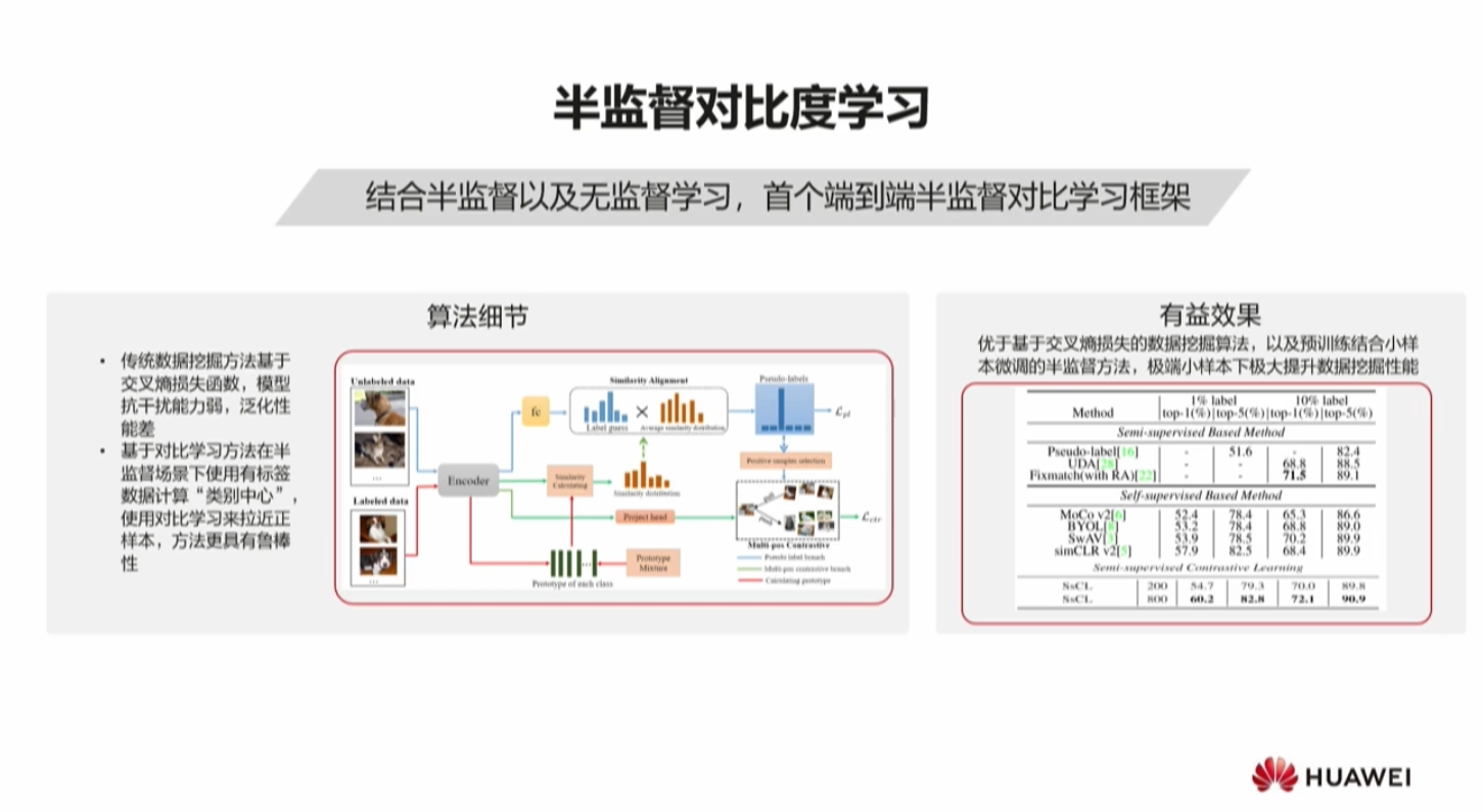 单纯半监督学习对初始状态十分敏感,初始数据少很难表达类别分布,会出现很多偏移(特别是1%)。自监督方法在数据上先训练,再利用1%微调整个网络(小样本分类)。是将整个模型预训练放到第一位,耗时耗力,没有更好把握云训练先验证知识,盲找。 为了避免这点,结合小样本类别先验融合到视觉预训练算法中,即半监督对比度学习,首个端到端半监督对比学习框架,其优化目标非常简单(1%标签),