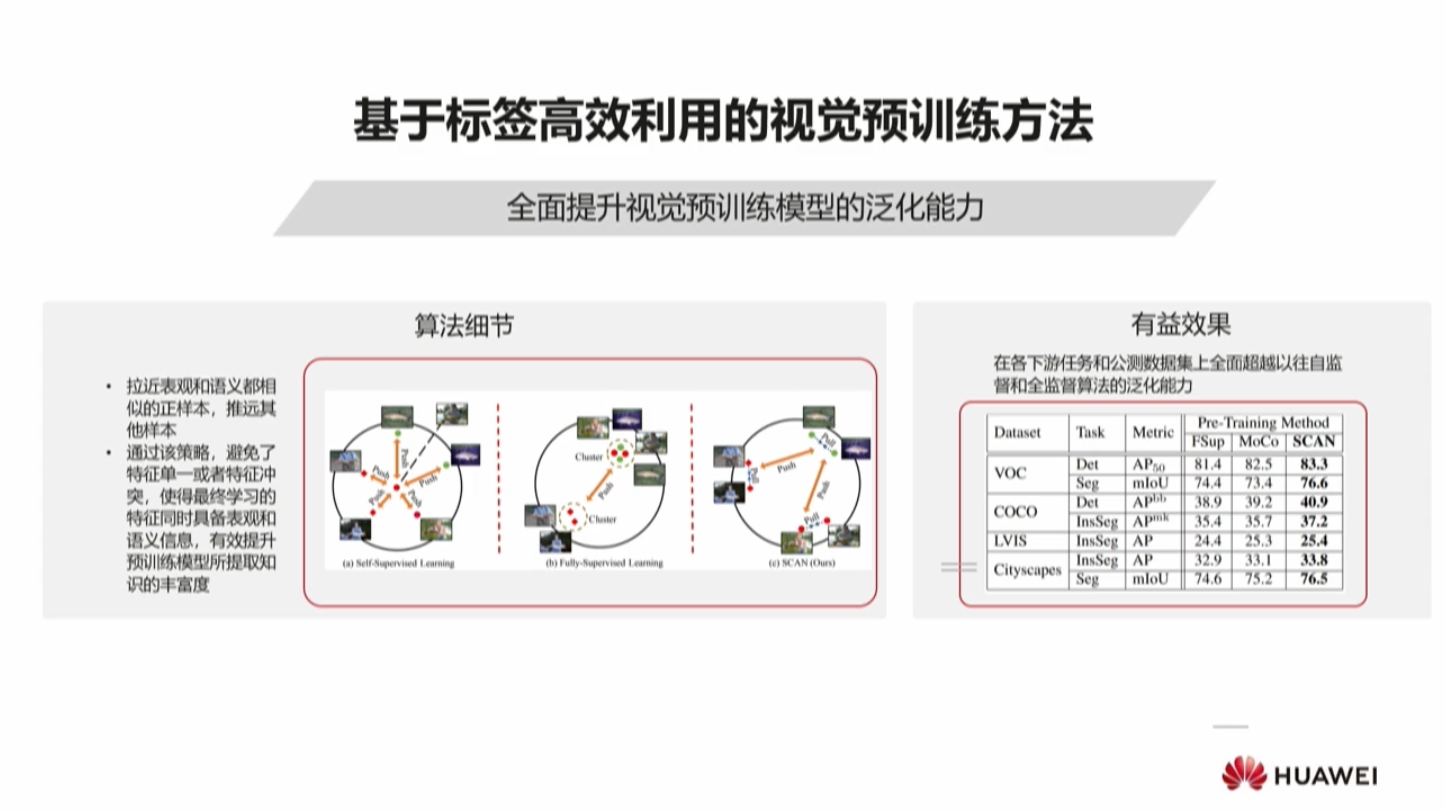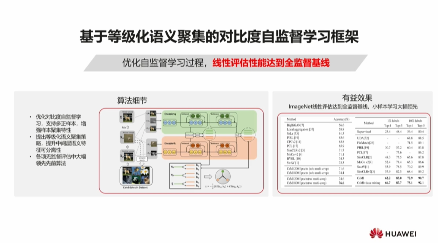 2 019 年底2 020 年初针对视觉图像提出了一种基于全局对比优化的方式作为自监督预训练的方法。 首次达到全监督性能 HUAWEI: HAS - RS0 , 但仍有许多问题 ,如预训练任务不合理,迭代收敛缓慢(算力需求大)导致如何拓展到达模型成为一个难题。