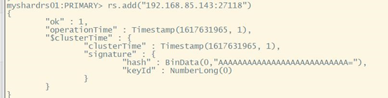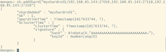sh.addShard(“myshardrs01/192.168.85.143:27018,192.168.85.143:27118,192.168.85.143:27218”)
