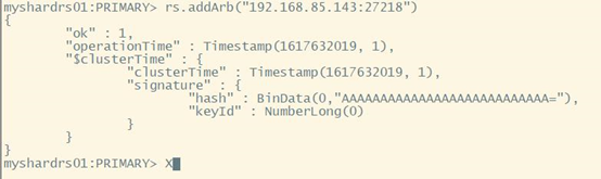 添加仲裁节点:rs.addArb("192.168.85.143:27218")