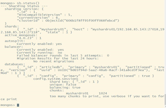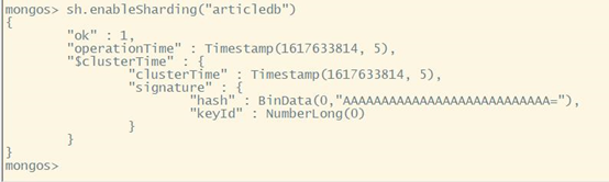 开启分片功能:sh.enableSharding("库名")、sh.shardCollection("库名.集合名",{"key":1}) 在mongos上的articledb数据库配置sharding: