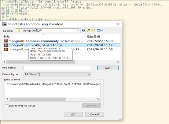如果主机上已经有MongoDB的数据包,可以上传,需要下载插件lrzsz