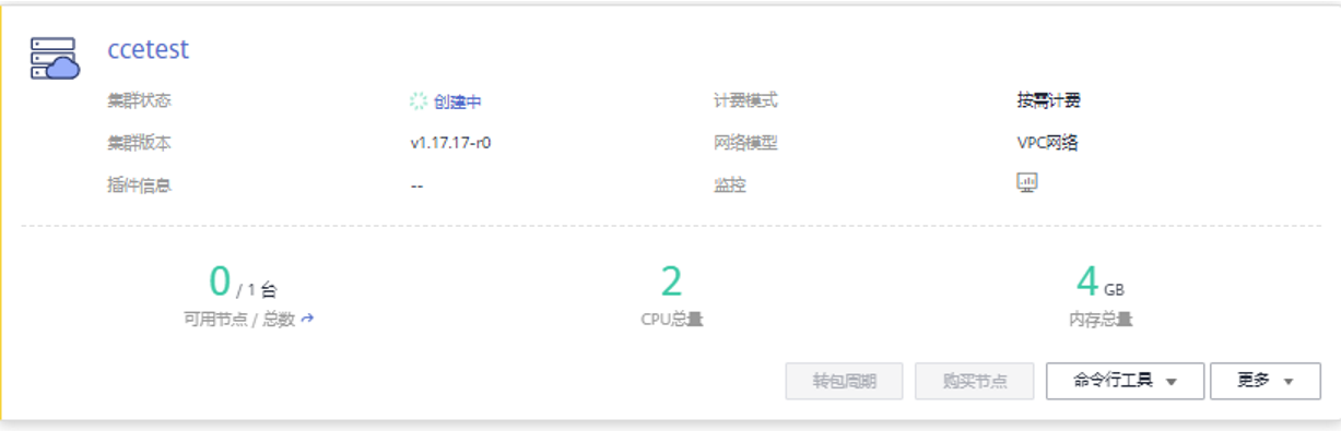 步骤1:准备一个CCE集群,带有一个节点并绑定EIP,其他规格默认即可。需要6-10分钟完成创建