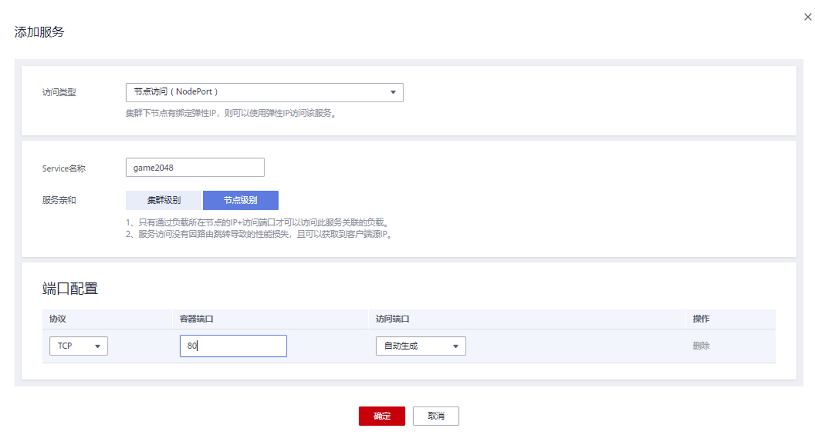 步骤4:添加服务,选择访问类型为节点访问,容器端口号为80