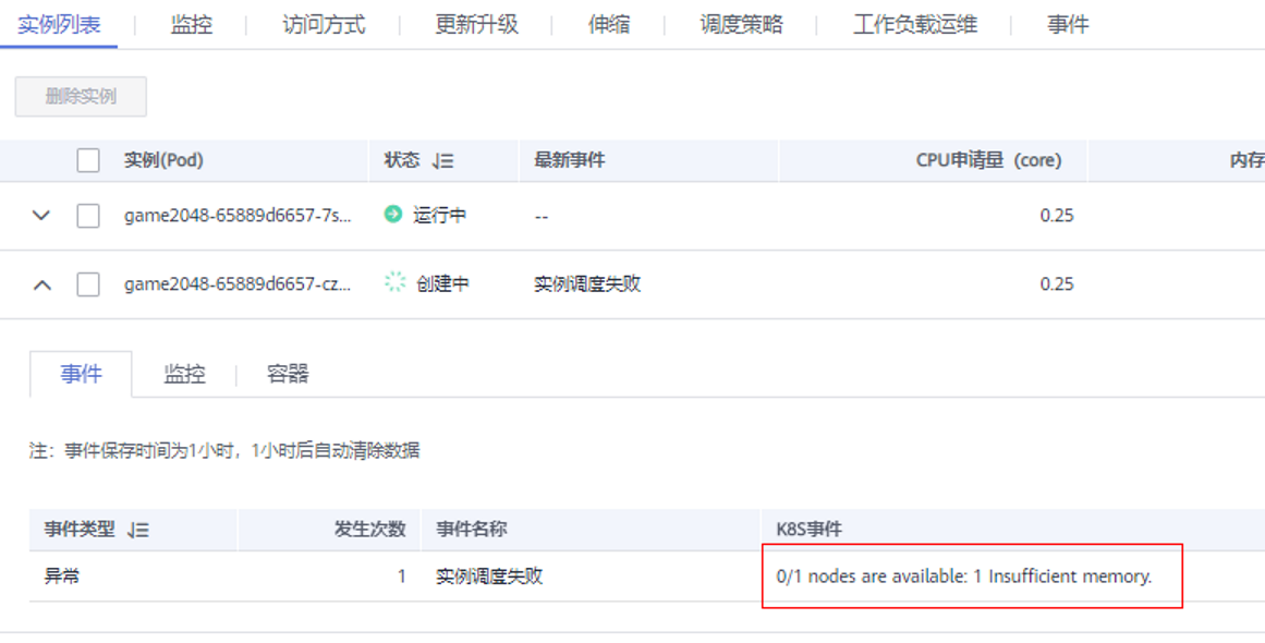 A:进入工作负载中查看详情,可看到实例时间为“内存空间不足”,针对此现象,可以扩容节点或者将实例个数调整为1