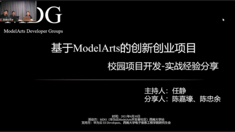 2021年6月30日,华为云MDG西南大学站“基于ModelArts的校园创新创业项目分享”全国技术直播活动在B站成功举行。本次华为云MDG西南大学站基于ModelArts的校园创新创业项目分享直播吸引了全国各地的500多位AI技术爱好者、AI开发者以及学生参与。西南大学电子信息工程学院硕士研究生、华为云云享专家陈嘉壕,人工智能学院硕士研究生、国家气象局卫星云图项目核心成员陈忠余担任此次直播的主讲嘉宾,电子信息工程学院硕士研究生、华为云MDG西南大学站核心成员任静担任主持人,给全网AI开发者、爱好者带来了一场别开生面的创新创业项目实战经验分享。