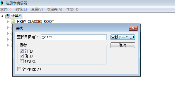 WIN键+R,输入“regedit”,然后按回车。由于网上也没找到注册表具体的路径,于是通过注册表编辑器的编辑==>查找,输入关键字“python”(也可以输入"python3"或者"python3.7")进行查找,注意不要勾选"数据"。