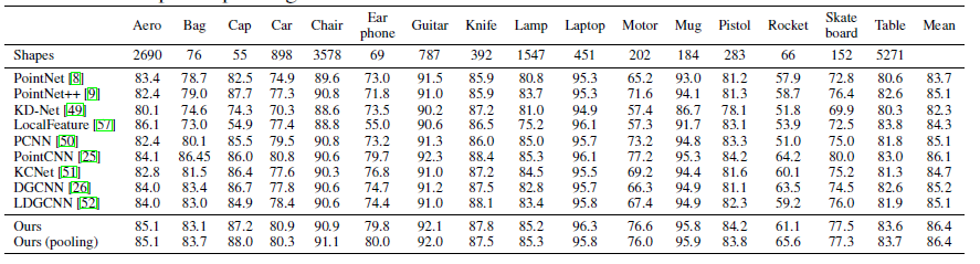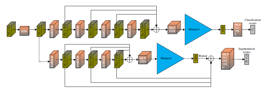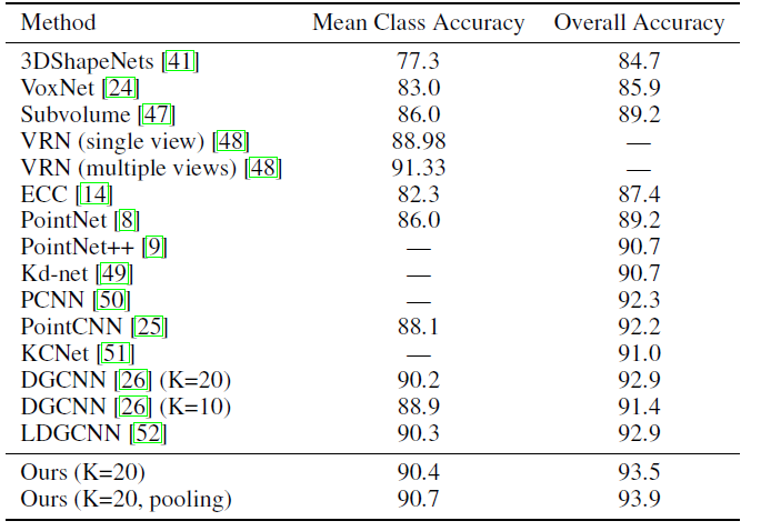 为了证明框架的有效性,作者在三个不同的数据集上进行了三个实验-分类(ModelNet40 ),部分分割(ShapeNet部件)和语义分割(S3DIS)。在所有实验中,实验数据都是从点云开始,并且在每个DiffGCN块中,根据点的特征构造一个K最近邻图。