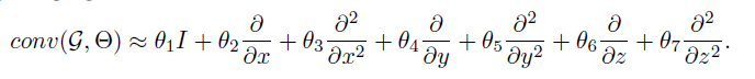 通过微分运算符进行卷积核 作者利用简单的算子来估计图上定义的非结构化特征图的梯度和拉普拉斯算子,给定无向图G =(V,E),其中V,E分别表示图的顶点和边,卷积核的公式如下,该核由图上定义的信号质量,梯度和拉普拉斯算子组成。