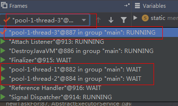 注意:只有在提交任务的时候才会创建新的任务。创建了一个10个线程的线程池,提交了3个任务,运行的时候生成了三个线程。