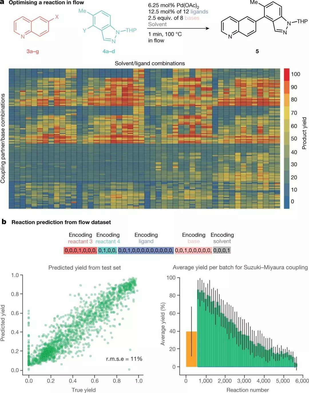 该团队对反应条件涉及到的4种溶剂,11种催化剂,7种碱,以及两个反应物可能带的不同活性基团的总计5760种反应组合进行了评估。并利用其液质联机实时分析的优势得到了产率热图(图4a)。