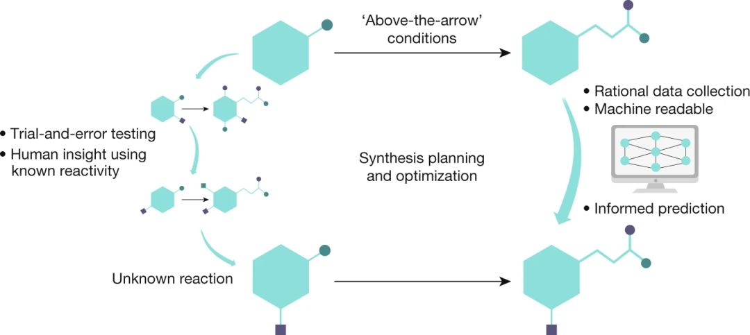 有机合成基本上是由学术实验室进行的,这些实验室由专门研究某些特定化合物或合成步骤的资助。尽管现代合成方法可以帮助我们获得相当复杂的分子,但是预测单个化学反应的结果依旧存在困难。只有通过智能决策帮我们选择最优的合成步骤(包括效率、质量和产量在内的指标为指导),关于预测“箭头上方”的反应条件的技术才能获得进步。因此通信和数据共享的方法需要从传统工具发展为机器可读的方法和开放式协作框架。这将会加速创新并需要创建具有标准化数据处理,管理和指标的化学物质公共资源。