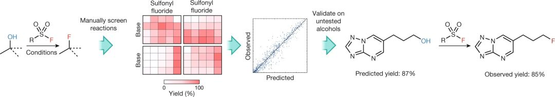 为了训练此反应的模型,对脱氧氟化反应的640个筛选反应中使用的底物和试剂制成表格。使用了随机森林算法,并对70%的筛选条目进行了训练。使用包含192个反应的测试集评估模型,并在训练集之外的5种结构不同的底物上进行验证。模型对这些反应的产率进行了合理的准确预测,可以让化学家评价反应的可行性和选择初始反应条件。与以前的研究相比,该训练集小80%,涵盖了更广泛的底物多样性,并纳入了多种机制。若将该脱氧氟化反应的训练集进行扩展,将其他变量(即化学计量,浓度,溶剂和温度)也考虑进去,从可能会使复杂反应空间更准确、更全面。
