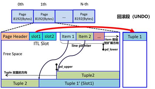 图1:Ustore数据存储示意图:数据在原page页,undo通过指针单独管理
