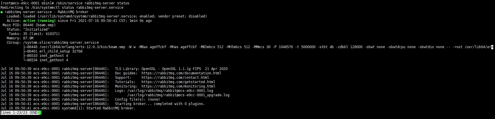 [root@ecs-e9cc-0001 ~]# /sbin/service rabbitmq-server start