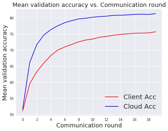 从图上我们可以看到,第一轮训练时云端准确率与租户端准确率差不多,都只有50%左右,20轮结束后租户端准确率达到75%上以,而云端准确率达到80%以上。