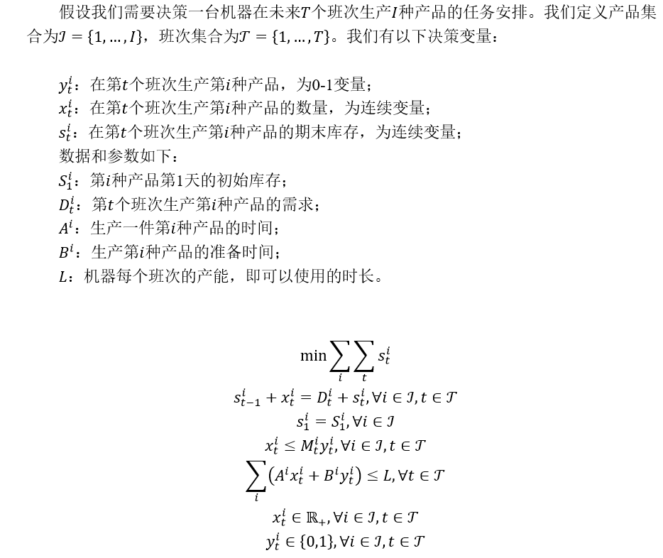 运筹学越来越广泛地被应用到了生产排程中。运筹学通常将一个实际的运营问题表达成数学模型,通过数学模型的求解来得到现实问题的解决方案。一个数学规划模型,常常有目标函数、决策变量和约束条件三部分组成。在制定生产计划的场景中,我们需要用决策变量去表达我们的决策内容,如:是否在某个时间段,某台机器上生产某种产品,如果生产的话具体的产量是多少,有了这些决策变量,我们还可以推导出一些辅助的决策变量,如每天每种产品的库存是多少;我们通过约束条件来表达生产过程需要满足的限制条件,如:库存的最大数量,班次的最大产能,当天初始库存、产量、需求和当天结束库存的相互关系;我们利用目标函数表达优化的目的,如最小化生产成本、库存成本。这个场景的问题被称作有资源约束的批量生产计划问题(Capacitated Lot-sizing Problem,CLP),该问题是一个NP难的问题。下面我们以一个简单的问题举例。