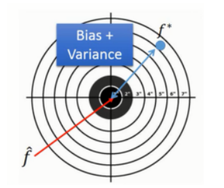 这个过程就像打靶, 就是我们的靶心, 就是我们投掷的结果。如上图所示, 与 之间蓝色部分的差距就是偏差和方差导致的。