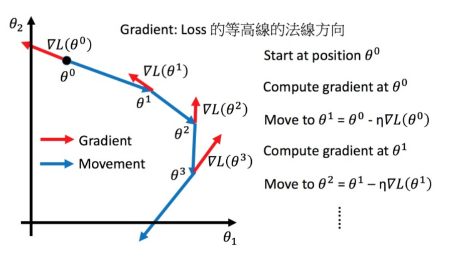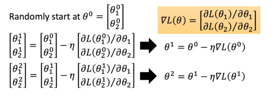 然后分别计算初始点处,两个参数对 的偏微分,然后 减掉 乘上偏微分的值,得到一组新的参数。同理反复进行这样的计算。黄色部分为简洁的写法, 即为梯度。