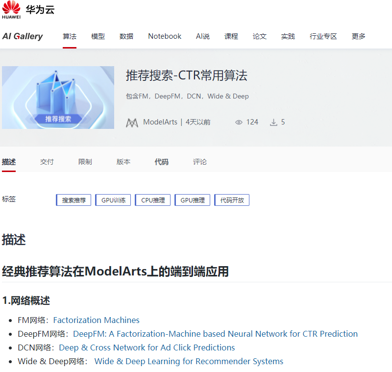 【摘要】 当前支持的预制算法有DeepFM,Wide&Deep,FM,DCN,未来会支持更多。支持下载代码,本地调试后,上传到modelarts上进行训练和推理服务部署https://marketplace.huaweicloud.cn/markets/aihub/modelhub/detail/?id=214dcb6c-9d58-40e2-b7f6-9091d22c8d36