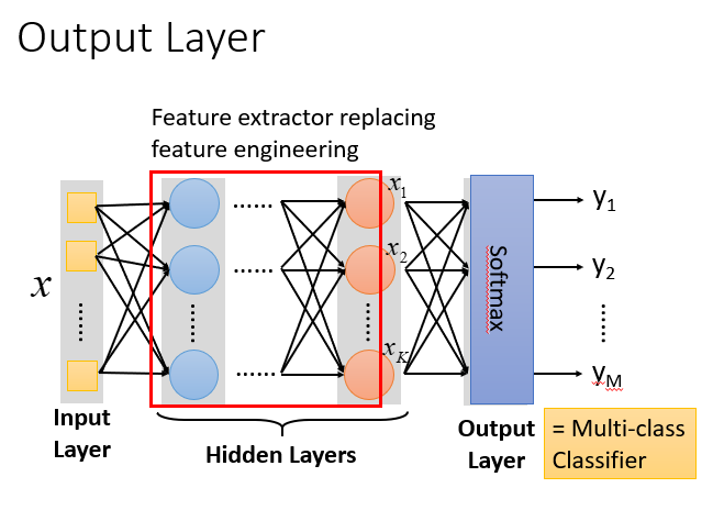 把隐藏层通过特征提取来替代原来的特征工程,这样在最后一个隐藏层输出的就是一组新的特征(相当于黑箱操作)而对于输出层,其实是把前面的隐藏层的输出当做输入(经过特征提取得到的一组最好的特征)然后通过一个多分类器(可以是softmax函数)得到最后的输出y。