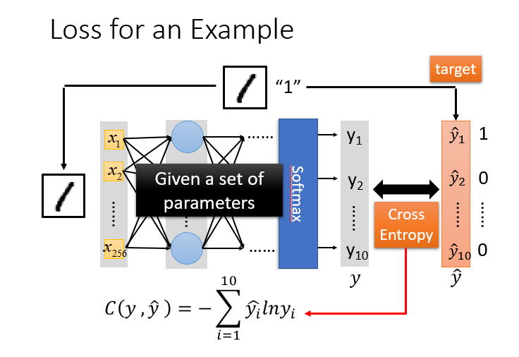 对于模型的评估,我们一般采用损失函数来反应模型的好差,所以对于神经网络来说,我们采用交叉熵(cross entropy)函数来对y和的损失进行计算,接下来我们就是调整参数,让交叉熵越小越好。