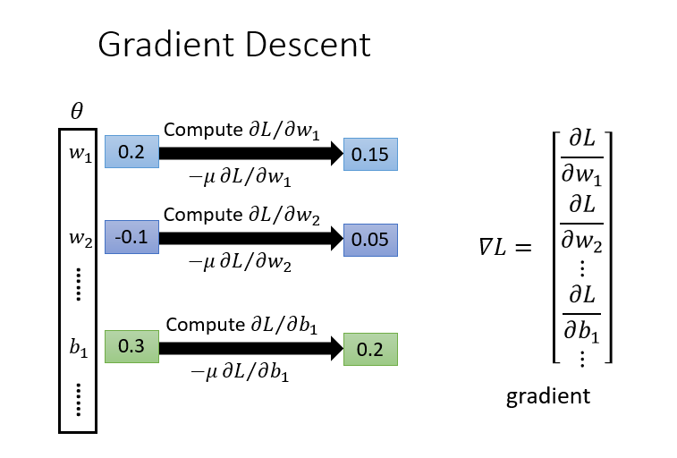具体流程:是一组包含权重和偏差的参数集合,随机找一个初试值,接下来计算一下每个参数对应偏微分,得到的一个偏微分的集合就是梯度,有了这些偏微分,我们就可以不断更新梯度得到新的参数,这样不断反复进行,就能得到一组最好的参数使得损失函数的值最小