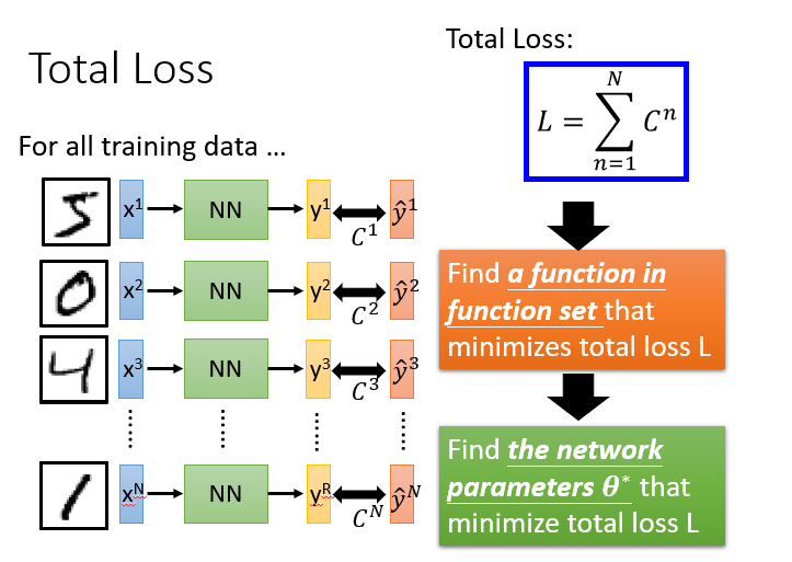 对于损失,我们不单单要计算一笔数据的,而是要计算整体所有训练数据的损失,然后把所有的训练数据的损失都加起来,得到一个总体损失L。接下来就是在function set里面找到一组函数能最小化这个总体损失L,或者是找一组神经网络的参数,来最小化总体损失L