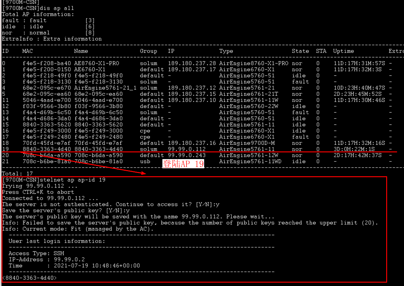 3、AC上进入system视图,然后执行stelnet ap ap-id X,X指的是AP在AC上查询的ID,可以通过display ap all查询