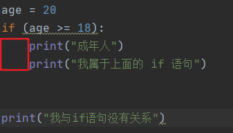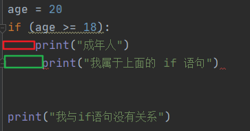 上述内容中 age = 20 ,确定大于 18,那么 age>=18 返回的结果为 True,就会执行 if 语句内部的代码块,而如何判断一段代码是否属于 if 语句内部呢,就是通过缩进判断的,具体如图: