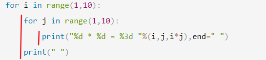 这个程序包含了 for 循环,for 循环嵌套,格式化输出字符串,还有不同级别的缩进。