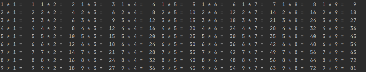 print("%d * %d = %3d "%(i,j,i*j),end=" ")