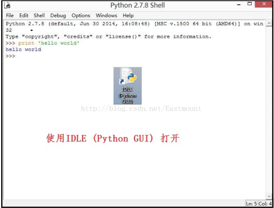 python解释器在Linux中可以内置使用安装,windows中需要去www.python.org官网downloads页面下载(如python-2.7.8.amd64.msi),安装Python集成开发环境(Python Integrated Development Environment,IDLE)即可.运行程序输入">>>print 'hello world'"则python解释器会打印输出"hello world"字符串. 如下: