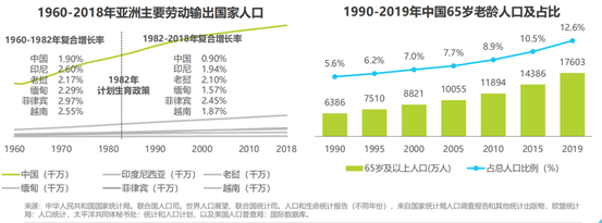 人口红利是外界经常提起的一个话题,这给社会造成了一种错误认识,即:只要人口持续增长,就必然有人口红利。实际上自联合国有记录以来,亚洲主要劳动输出国家的人口始终处于一种高速增长的状态,但几乎只有中国享受到了这种人口红利。这有赖于一系列的历史发展机遇。中国于1978年施行改革开放政策,那时候中国有大量年轻又不熟练的青壮年劳动力,他们在过去与发达的西方经济处于一种不正常的分隔状态,西方经济体整体富裕乐观,有较高的信贷杠杆,有现金购买中国制造的商品,所以中西方之间生产与消费形成了一组比较融洽的合作关系。这才是中国之所以存在人口红利的根本原因。而现在中国这批劳动力在迅速的老化,并且随着中国政治军事经济三方面影响力的增强,上述这种融洽的关系已经不存在。导致一些基础工业岗位流向越南等劳动报酬更低的国家,这种全球局势变化,使有曾经因成为“世界工厂”而发展壮大的国家,必然且不得不走向一种更高级的社会状态,以适应环境。