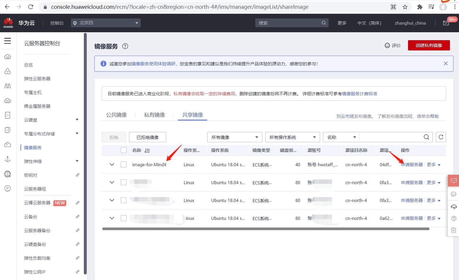 点击:https://console.huaweicloud.cn/ecm/?locale=zh-cn®ion=cn-north-4#/ims/manager/imageList/shareImage