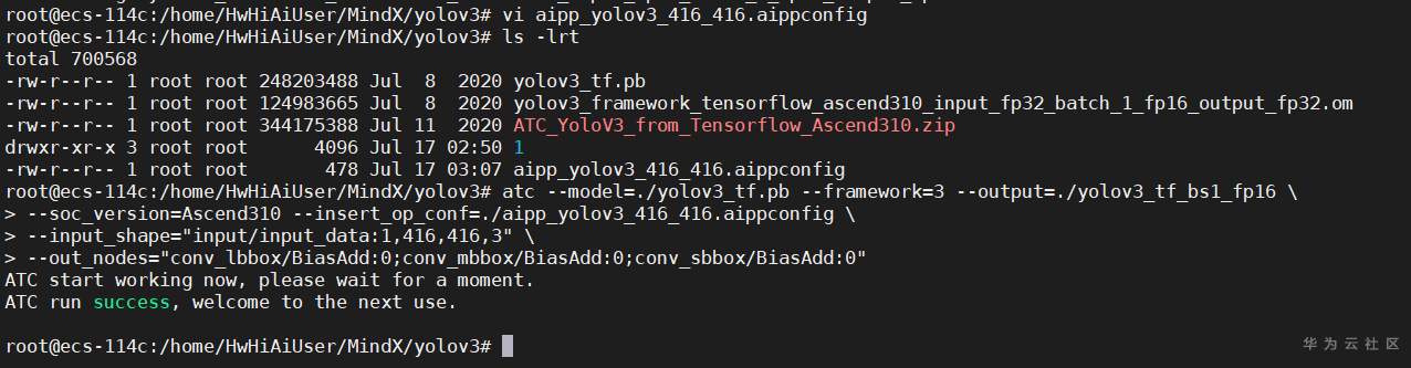 atc --model=./yolov3_tf.pb --framework=3 --output=./yolov3_tf_bs1_fp16 \