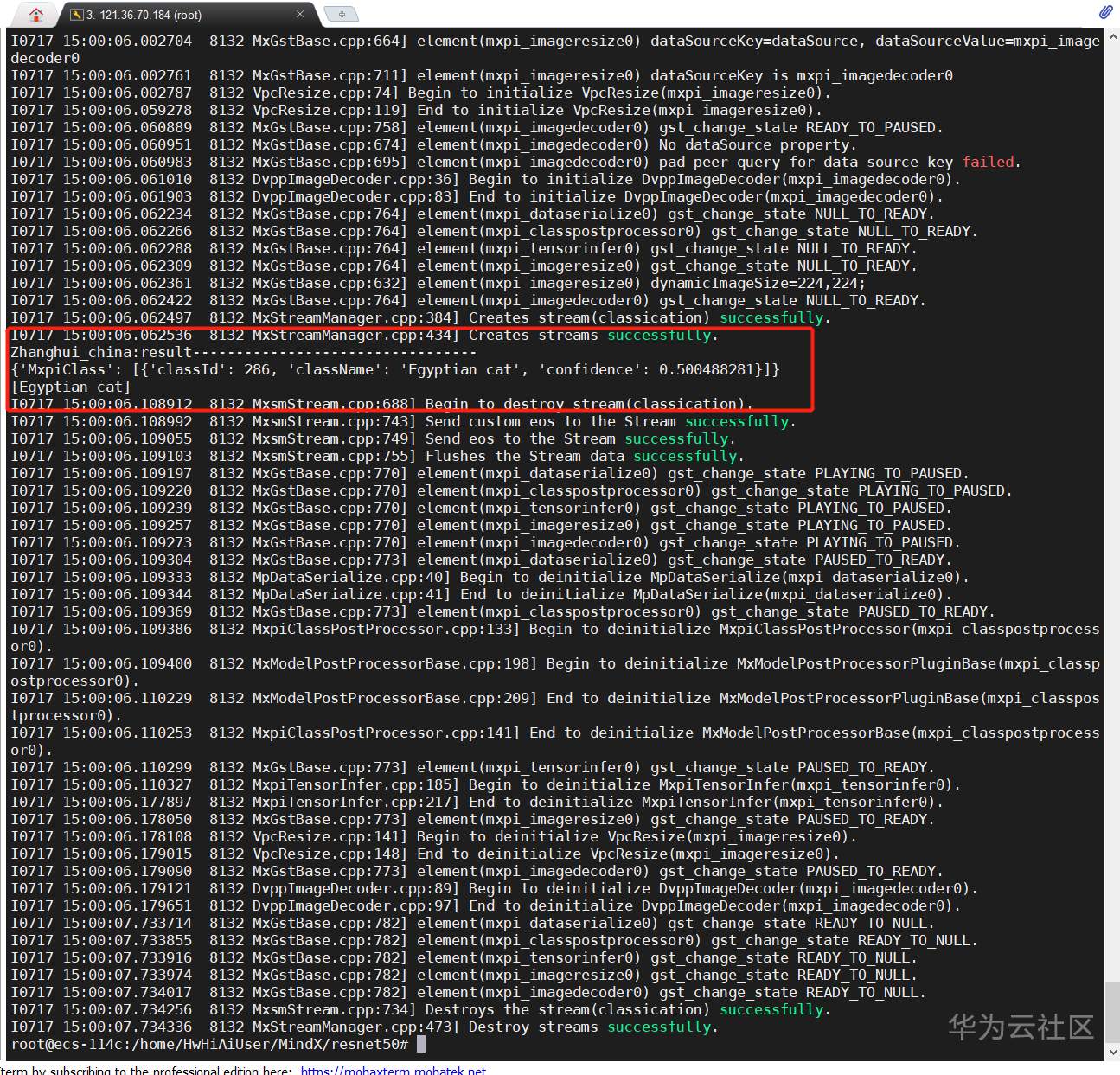 {'MxpiClass': [{'classId': 286, 'className': 'Egyptian cat', 'confidence': 0.500488281}]}
