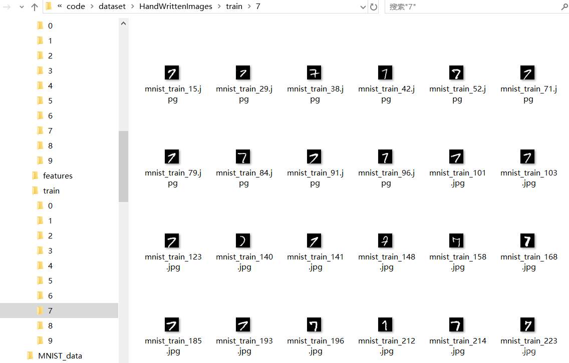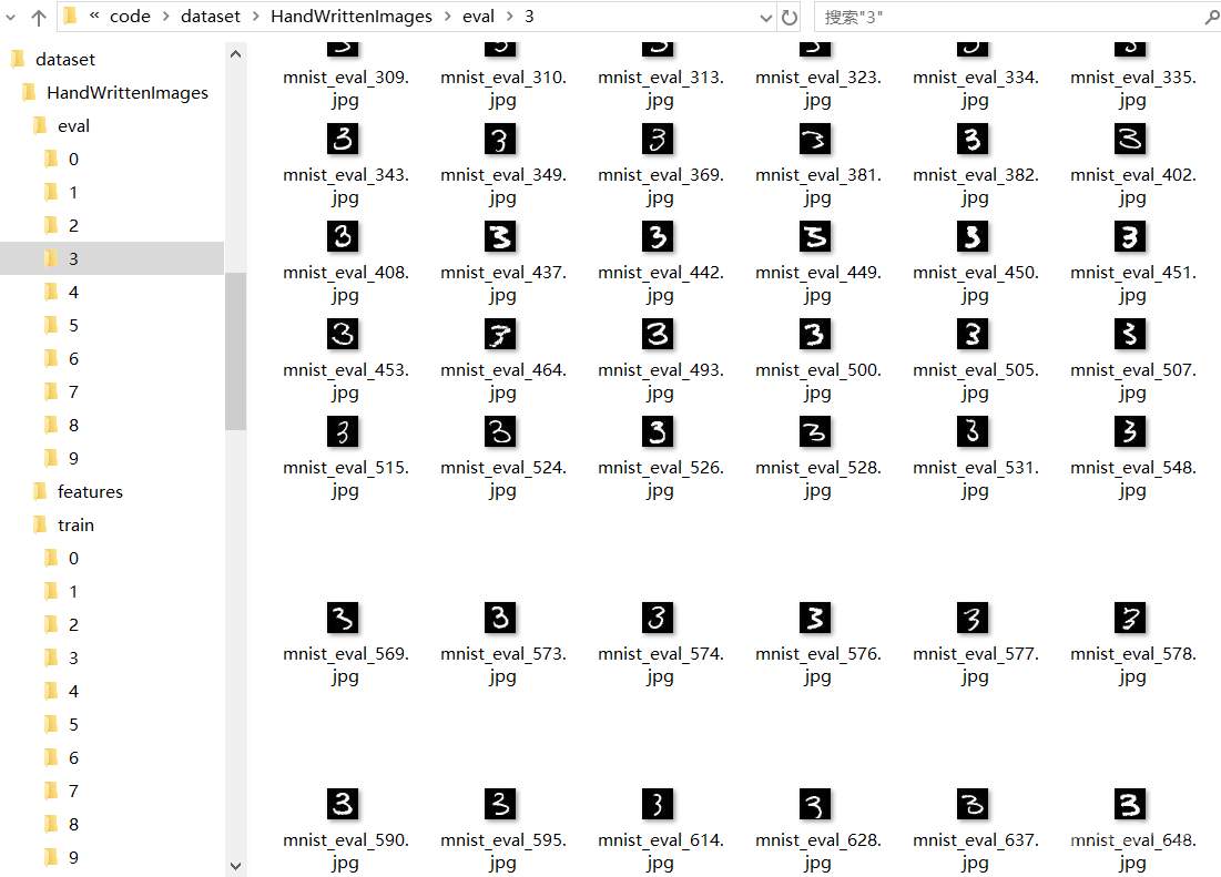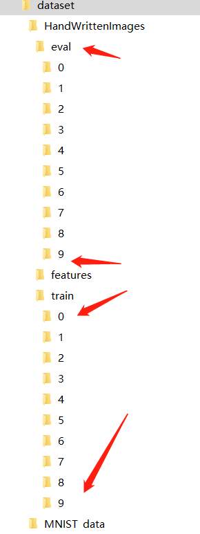 执行了这个脚本之后,会生成dataset下的MINST_data目录,存放的是原始的MNIST数据集;也会生成dataset下的HandWrittenImages下的train和eval目录下的 0~9各10个目录: