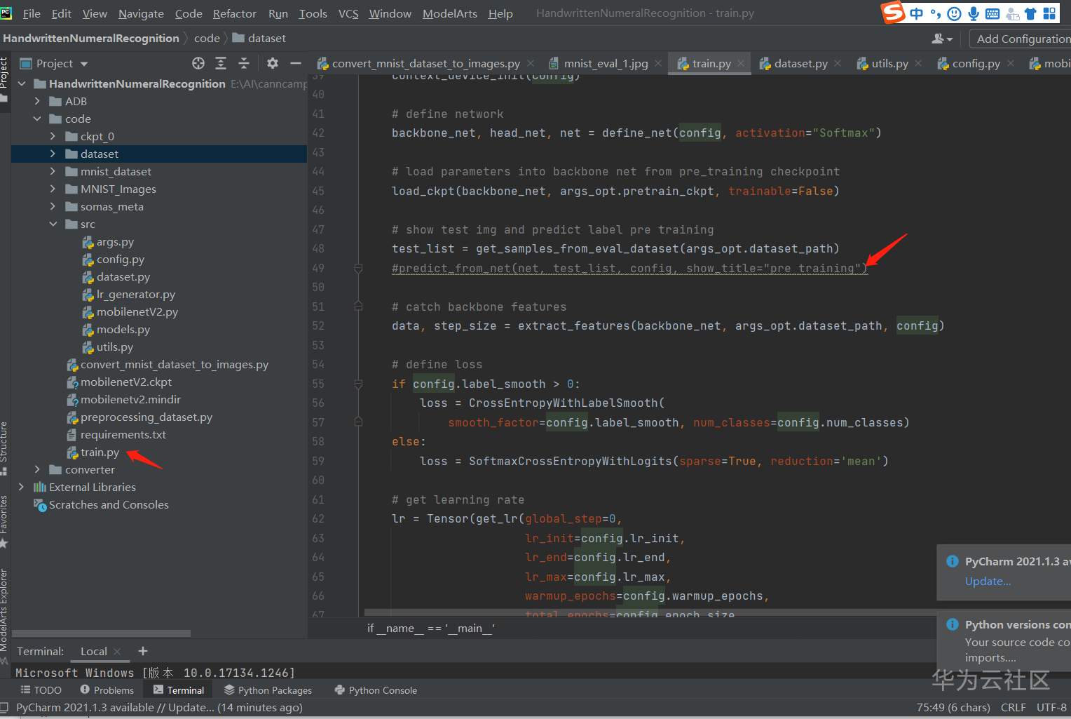 再看看train.py的训练代码,原来之前会预测一下,之后也会预测一下。可以暂时将前面的预测注释掉。