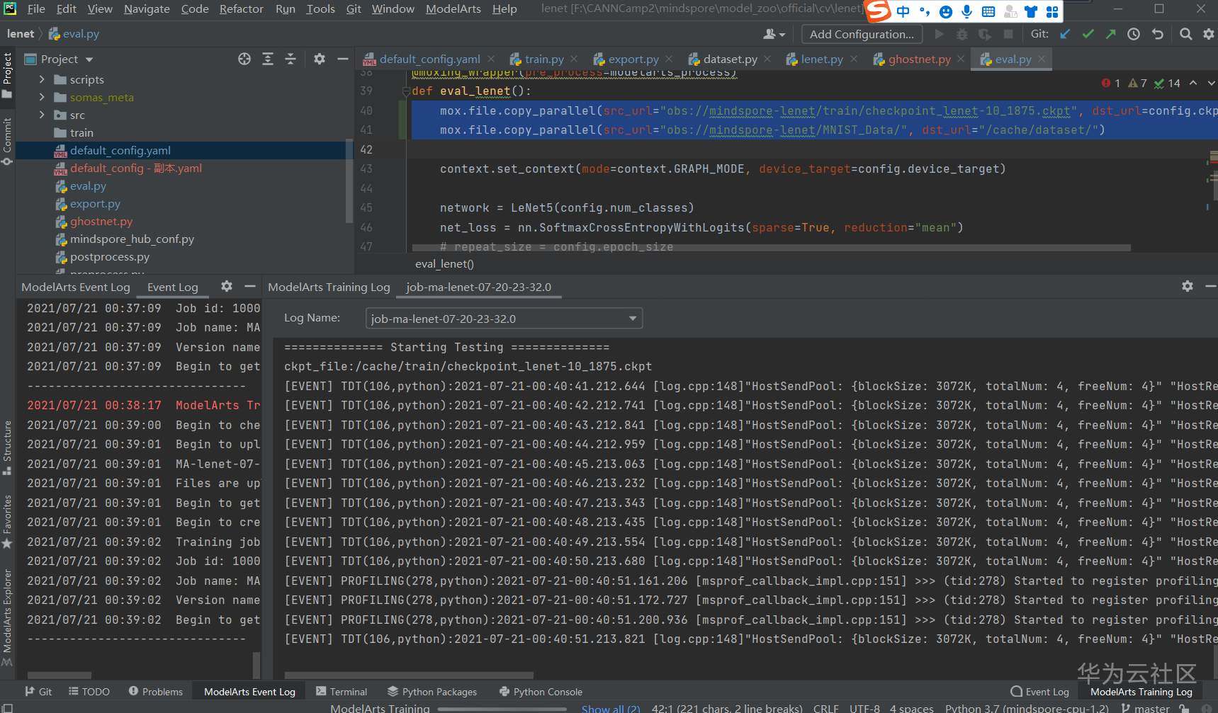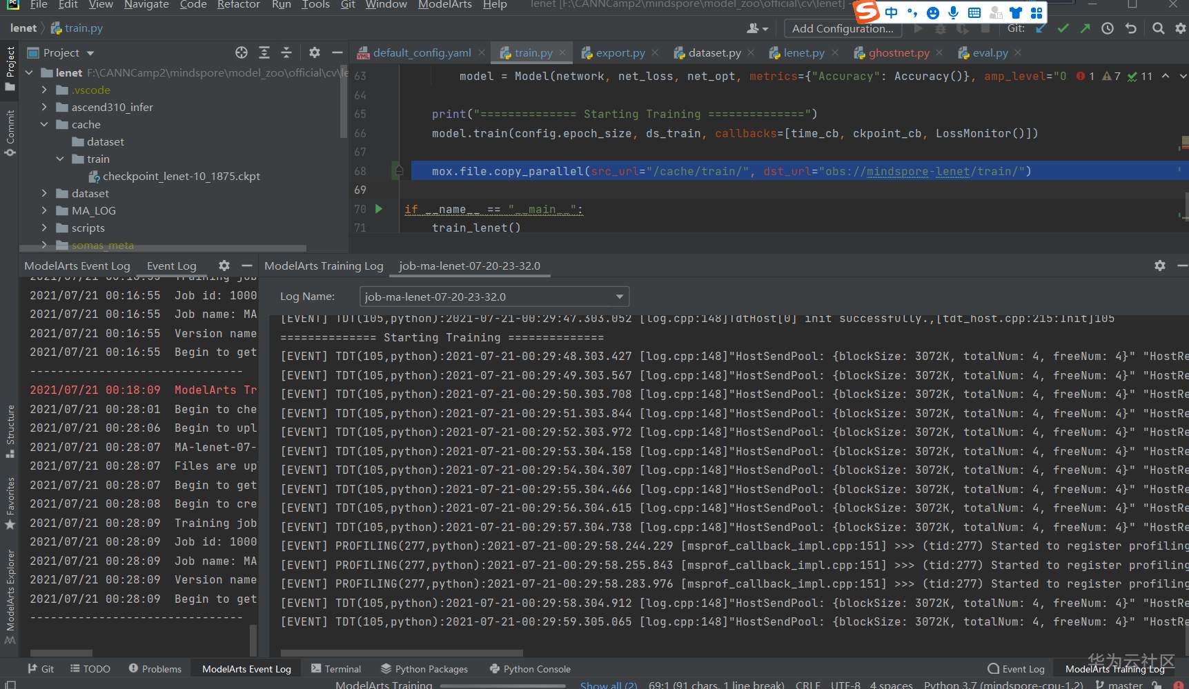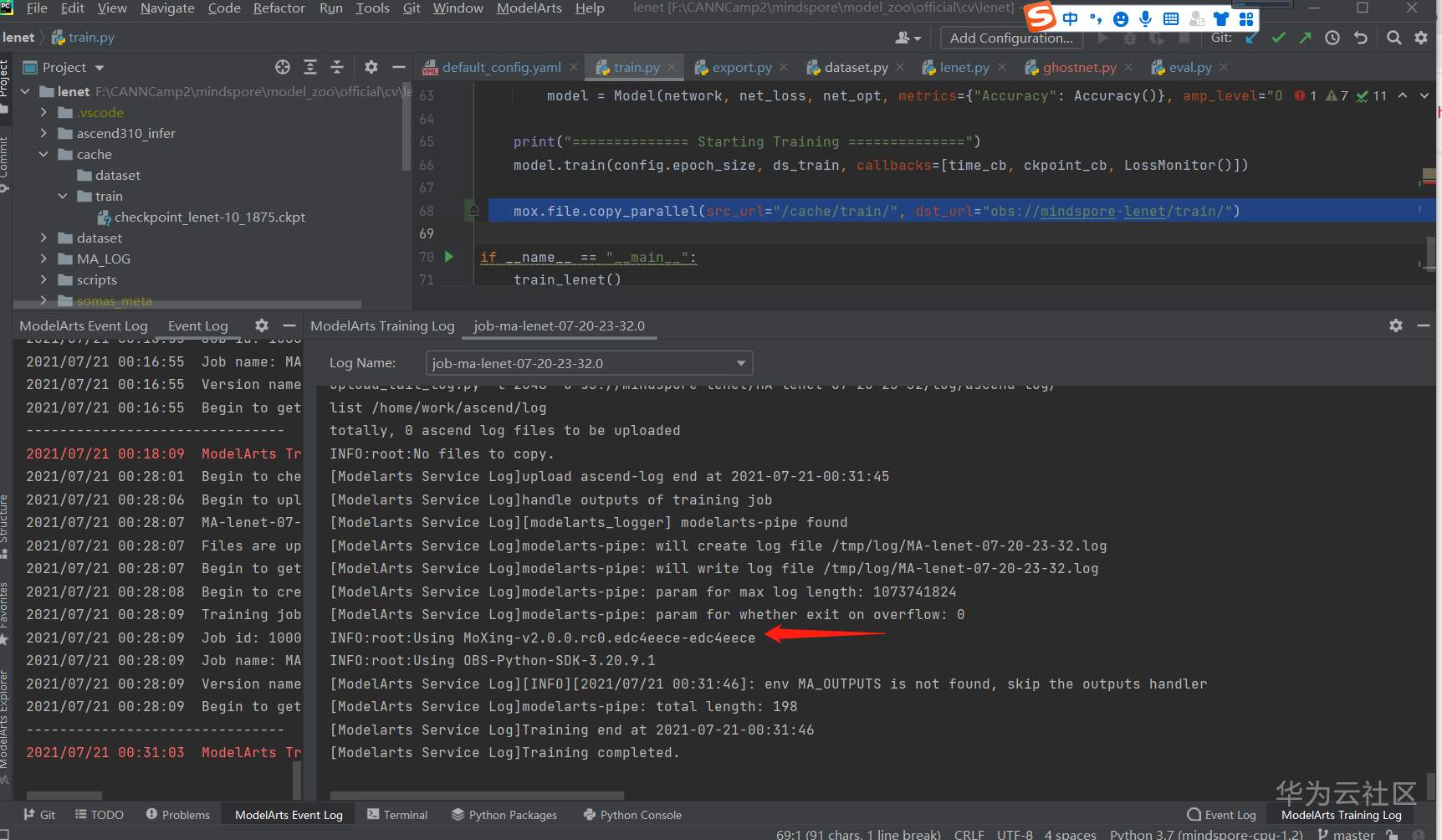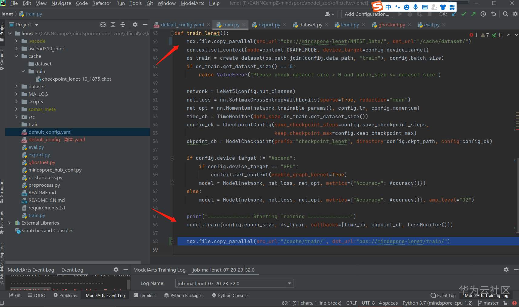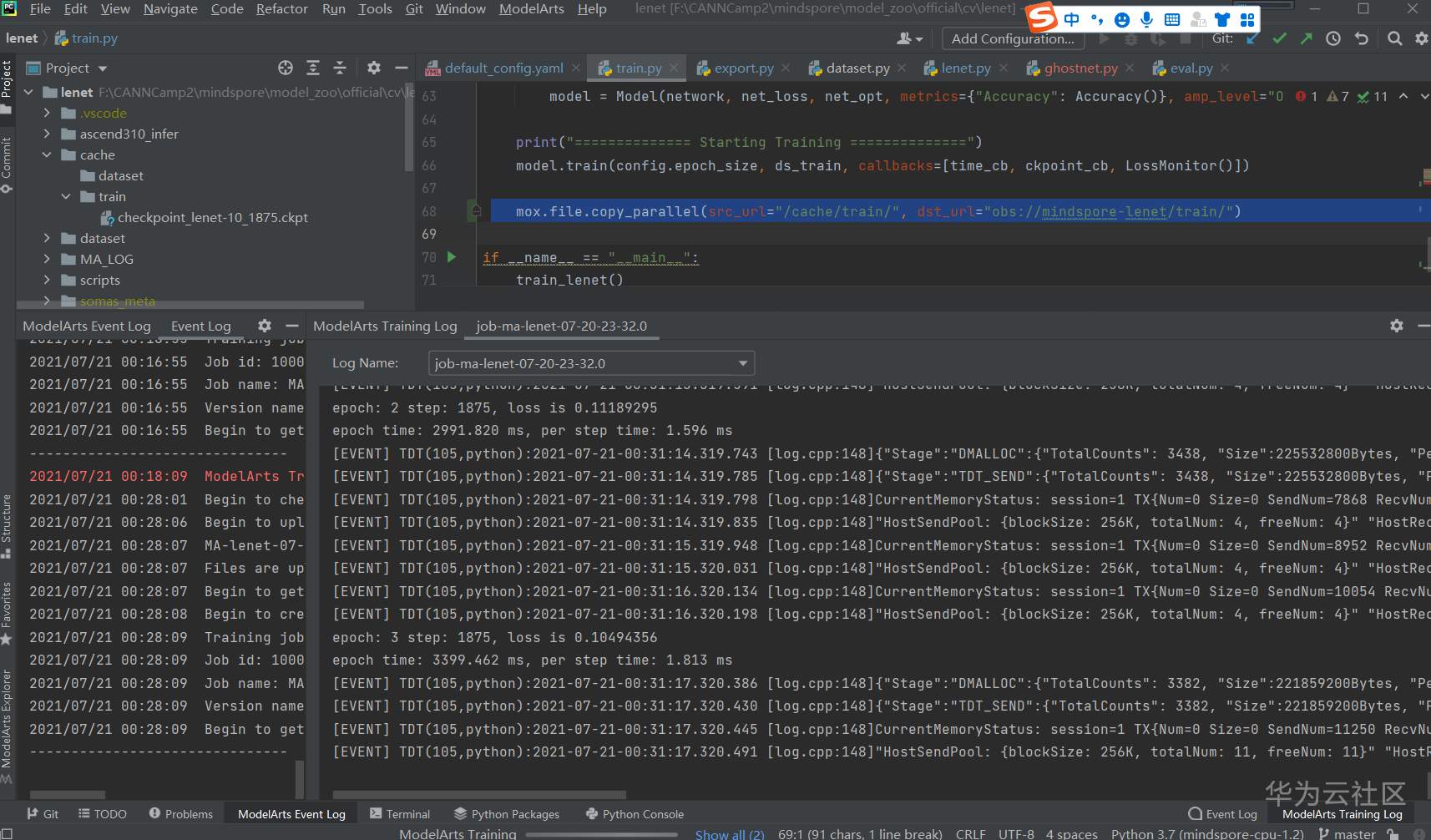 且需要修改train.py 将数据集从OBS copy到docker,再在结束时从docker拷贝回OBS。
