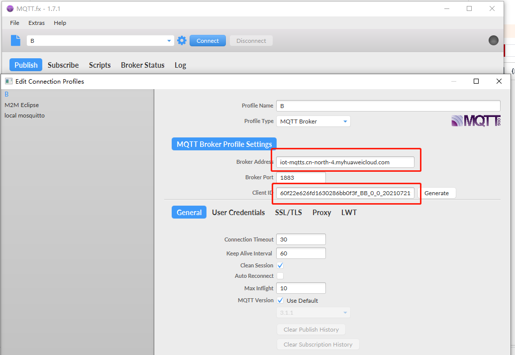 只需要将 MQTT Broker Profile Settings 下 Broker Address 填入华为云 地址 iot-mqtts.cn-north-4.myhuaweicloud.com