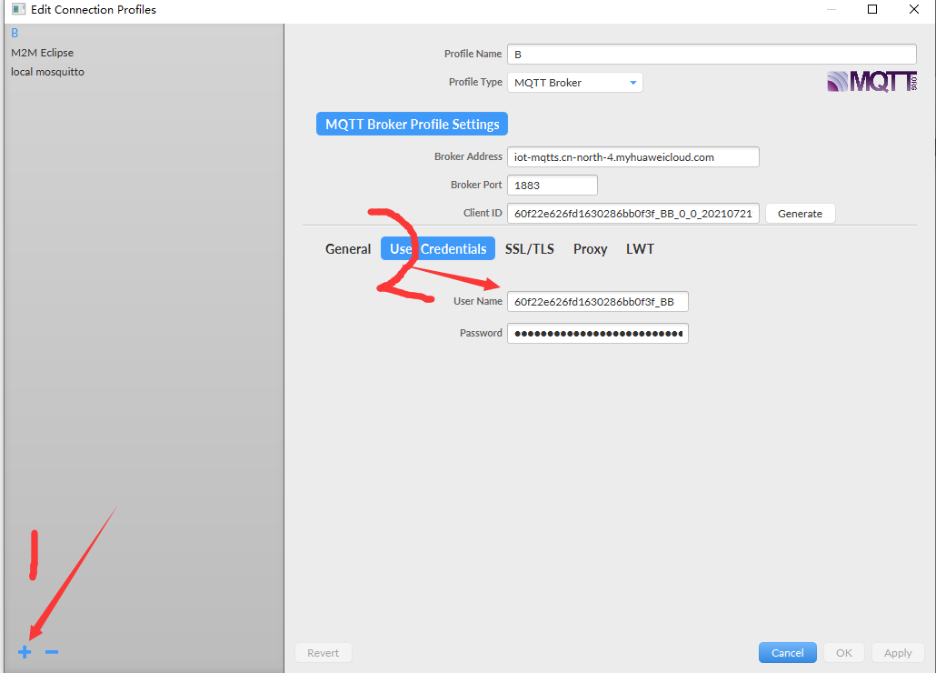 下面选项卡 ,Use credentials ,用户资质 ,填入 ,之前 mqttclientldGenerator ,生成器 ,生成的 ID 和 密码 即可