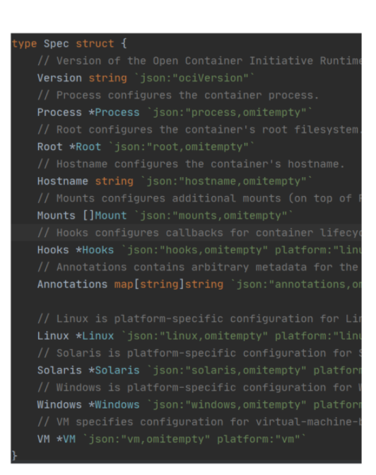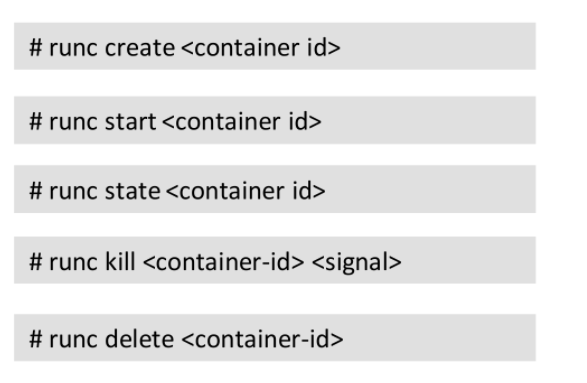 - OCl runtime spec定义了运行时实现中,文件格式和命令行格式,runc、 kata、gVisor等运行时都符合这个标准