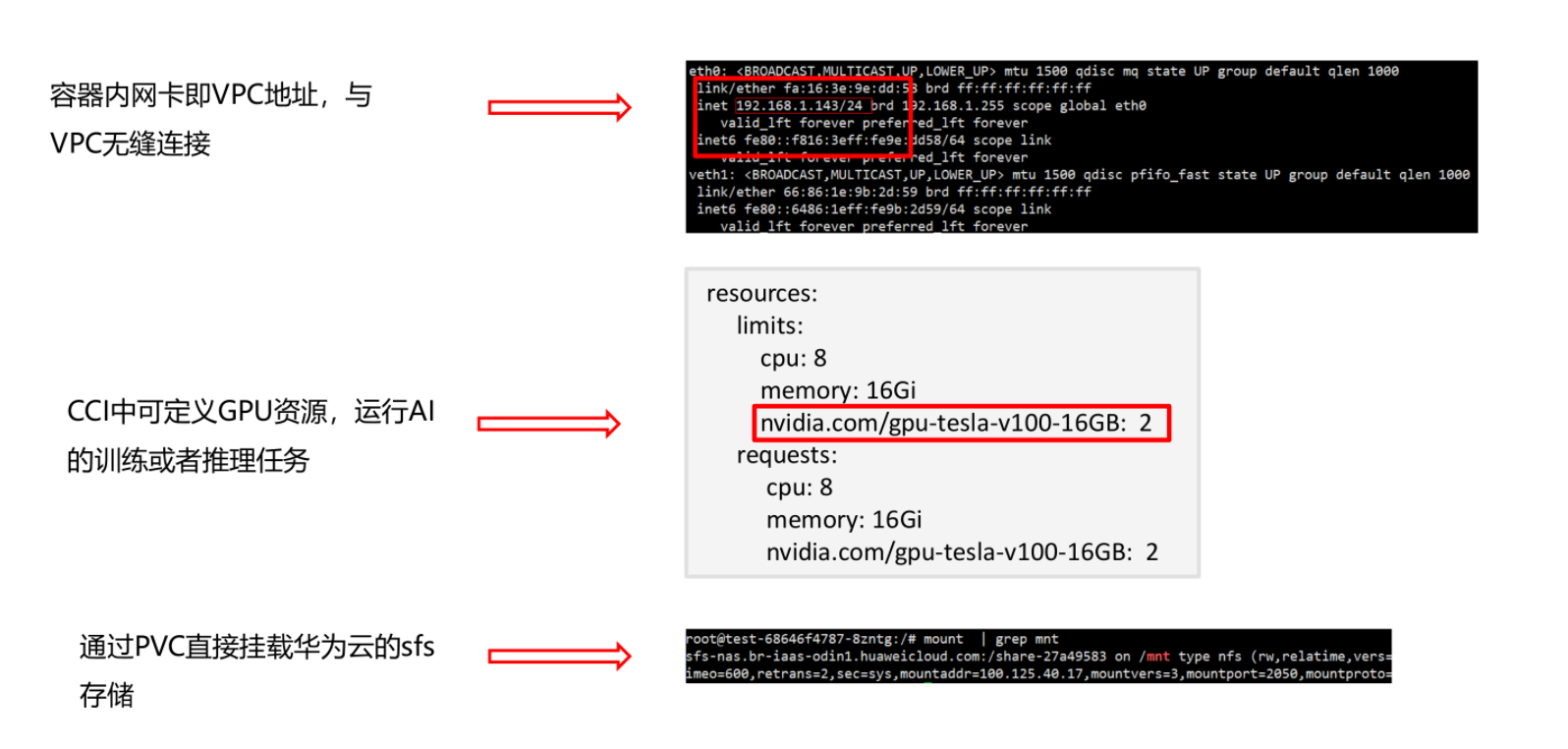 -华为云的安全容器和华为云的VPC网络、OBS、SFS、EVS等服务可无缝对接。