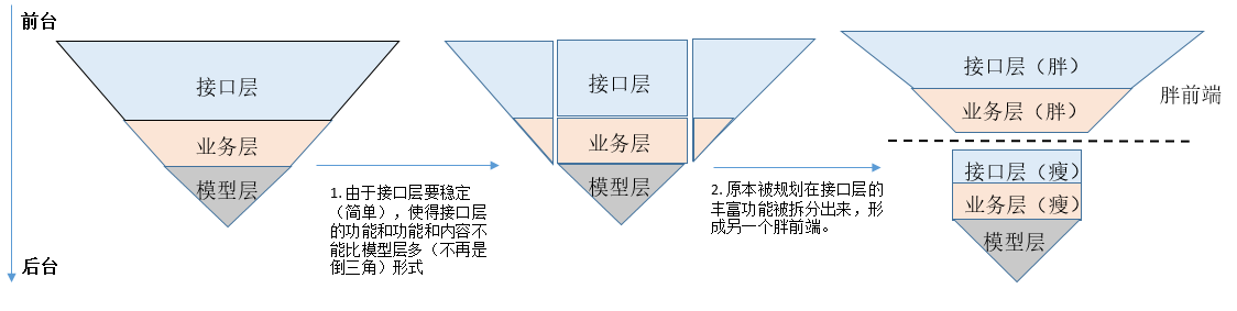 如上图,从上到下,为从前台到后台,往往,前台的功能比后台更丰富。比如基于JAVA开发的应用的数目和功能是要比Java的JDK接口的功能丰富得多的。从广义上说,某门语言的应用可以看做该语言的前台,把朴素的语言功能包装成一个个场景的解决方案。但是,根据我们上面的分析,要求接口层尽可能稳定(简单),由【删繁就简】大法,那就删掉一些接口和功能吧,又因为这个垂直的应用栈,去除的功能会影响整个应用场景的功能,不能删,故这部分“待删除”的功能往往会被整合成另一个相对独立的组件(胖前端)。【删繁就简】大法最终演变成了【分而治之】。