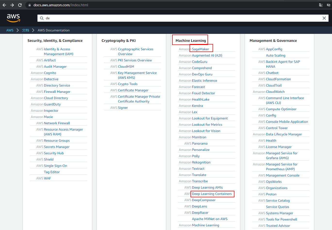从产品文档的组织结构上看,“Deep Learning Containers”归属于“Machine Learning”模块下,与AI平台“SageMaker”平级,如下图所示: