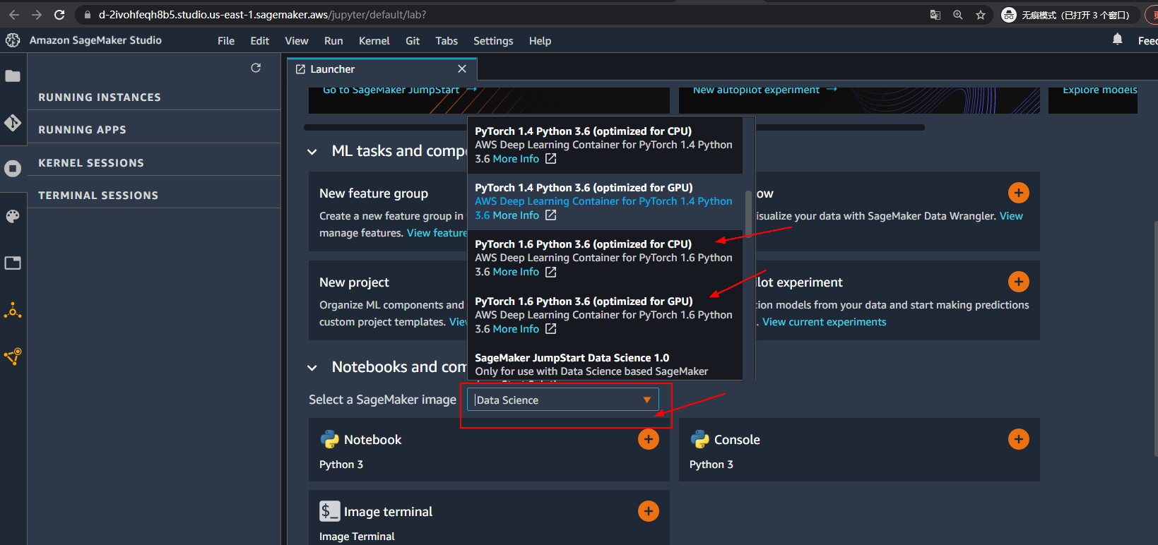 SageMaker和“Deep Learning Containers”出现交集的地方有两个,一个是在SageMaker的studio界面中,提供了相关镜像的下拉列表框供选择(没有明确说明是training镜像还是inference镜像,估计是training镜像):