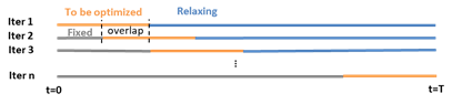 固定松弛法的主要思路是,根据期数对原问题的换型变量进行分组,每一轮利用混合整数规划(MIP)求解器只求解其中一组变量而固定或松弛其它换型变量,从而简化问题,加快求解时间。固定变量,即将部分变量固定为之前轮次的求解结果;松弛变量,即将变量的可行域松弛为连续闭区间。第一轮只有求解变量和松弛变量。之后加入固定变量。最后一轮没有松弛变量。每一轮固定的变量有所重合,通过提升期数之间的交互来提升求解结果,获得更好的可行解。