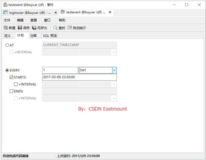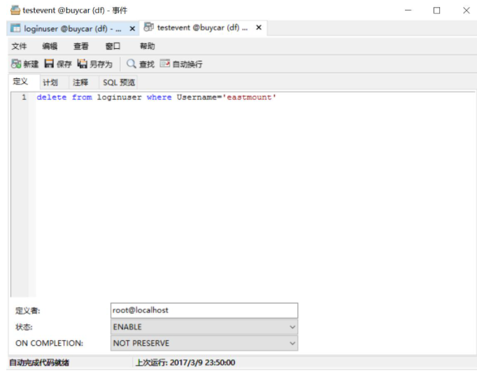 当前时间点为2017年3月9日 23:48,我们设置23:50执行删除eastmount数据操作。其中SQL语句的Event代码如下:
